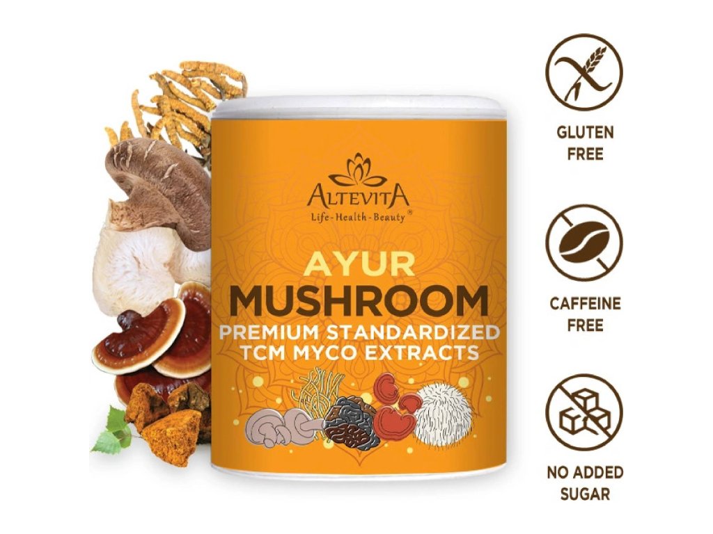 Altevita AYUR Mushroom není jen obyčejný nápoj. Je to koncentrovaná síla pěti nejúčinnějších léčivých hub světa, pečlivě vybraných a zpracovaných tak, aby vám přinesly maximum zdravotních benefitů.