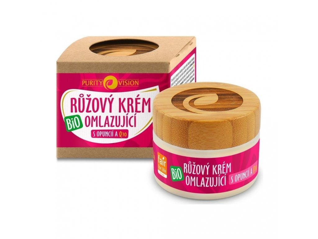 Vlastnosti: omlazující krém, v BIO kvalitě, s jemnou květinovou vůní, vhodný jako denní a noční krém, hydratuje pleť, navrací jí pružnost, redukuje vrásky, rozjasňuje pleť, dodává pleti vitalitu a zdraví. Fair Trade Bio Bambucké máslo PURITY VISION® je univerzální, vysoce vyživující, pečující, plné vitamínů a minerálů. Je nezbytnou ingrediencí kosmetických přípravků a používá se v lázních a kosmetických salónech pro ty nejnáročnější klienty. Pochází z čistých oblastí východní Afriky, z plodů méně známého a hůře dostupného druhu máslovníku afrického (Vitellaria Nilotica). Obsahuje proto mnohem více prospěšných látek než běžně dostupná bambucká másla. Rozpouští se při tělesné teplotě, díky čemuž se snadno a rychle vstřebává do pokožky. Oceníte jej zejména pro jeho hydratační a regenerační účinky. Tajemství a síla macerátů. Macerace je typ extrakce, kdy se bylina naloží do oleje či másla na delší dobu. Do másla se tak uvolní účinné látky z byliny včetně její vůně. Macerát růže damašské je známý pro svoje omlazující účinky a dodává krému jedinečnou květinovou vůni. Vanilkový macerát má kromě neopakovatelné sladké vůně i zklidňující schopnosti. Tonka reprezentuje v krému jemné kořeněné tóny. Vzácný Opunciový olej se získává ze semen plodů kaktusu opuncie, ty obsahují pouze 5 % oleje. Z 800 kg ručně sbíraných zralých plodů se získá 25 kg semínek, ze kterých se vylisuje pouze 1 litr oleje. Opuncie roste v poušti v čisté přírodě, a proto si zachovává svoji původní sílu a vitalitu. Opunciový olej je právem považován za nejúčinnější zbraň proti stárnutí pleti a tvorbě vrásek. Své jedinečné vlastnosti získává díky vysokému obsahu vitalizujících a regeneračních látek, jakými jsou esenciální mastné kyseliny omega 6 a 9, a velké množství přírodního antioxidantu (vitamín E). Olej dále obsahuje aminokyseliny, které podporují tvorbu kolagenu, a urychlují tak regeneraci buněk. Opunciový olej zlepšuje strukturu pleti a zanechává ji zářivou a mladistvou. Přírodní Koenzym Q10 má silné antioxidační schopnosti, je skvělým pomocníkem v boji proti přirozenému stárnutí i proti stárnutí způsobené UV zářením. Navíc pomáhá při tvorbě kolagenu a elastinu, a snižuje tak výskyt vrásek a navrací pokožce zpět její pružnost.